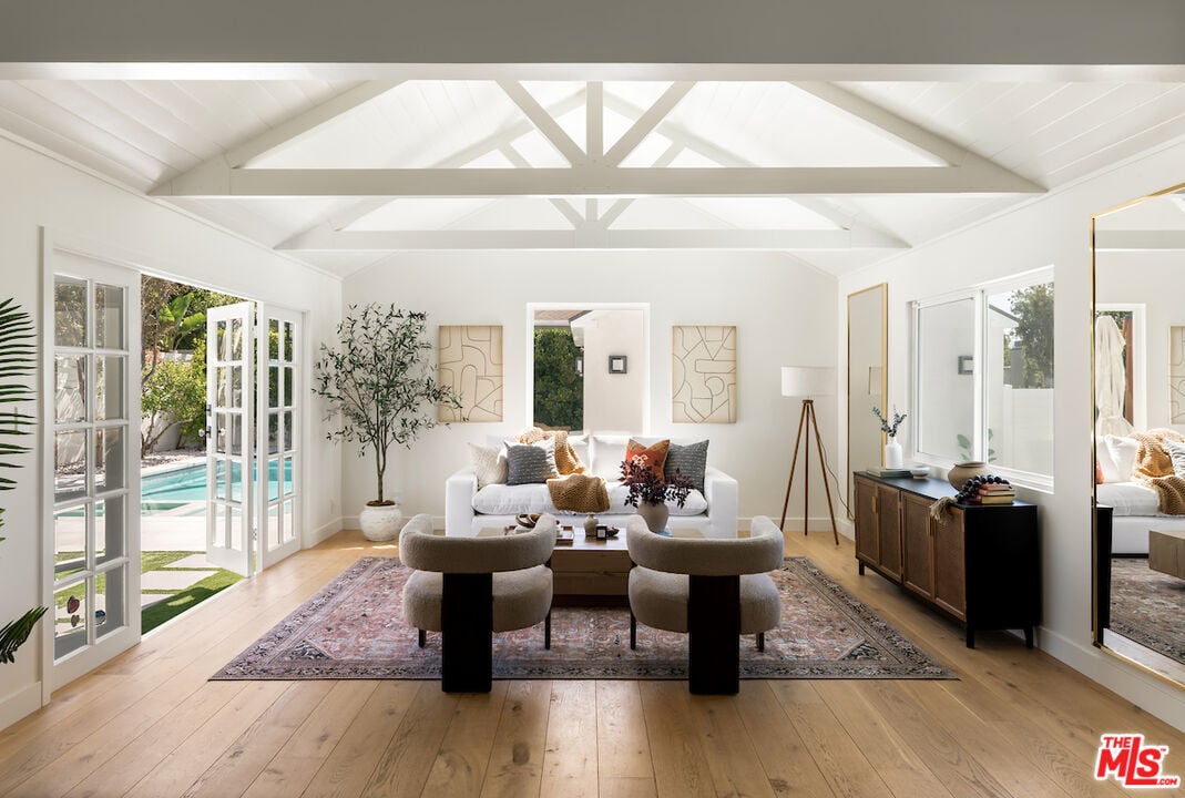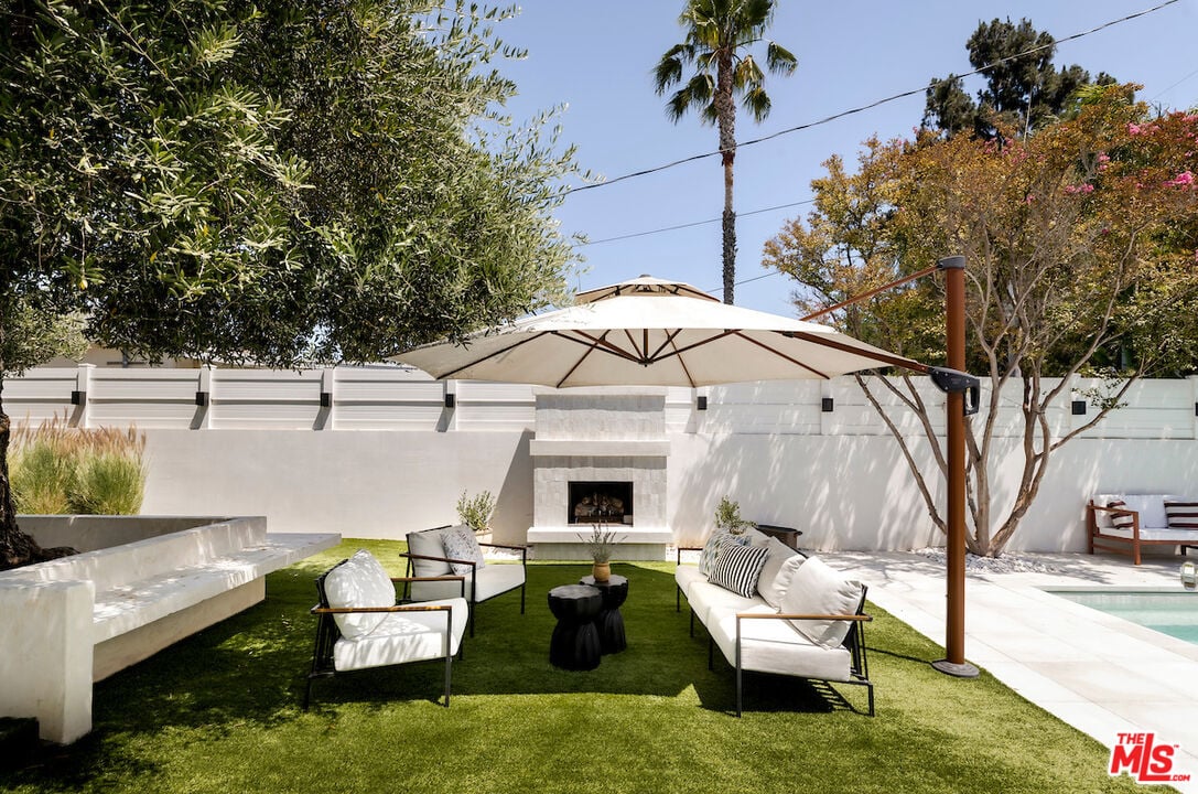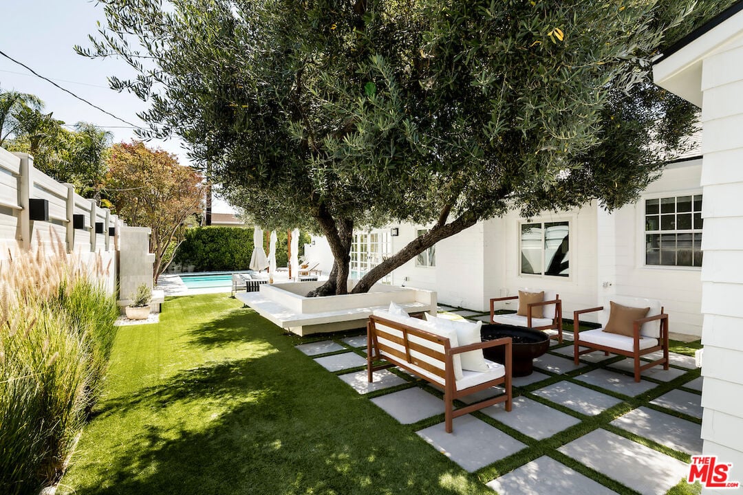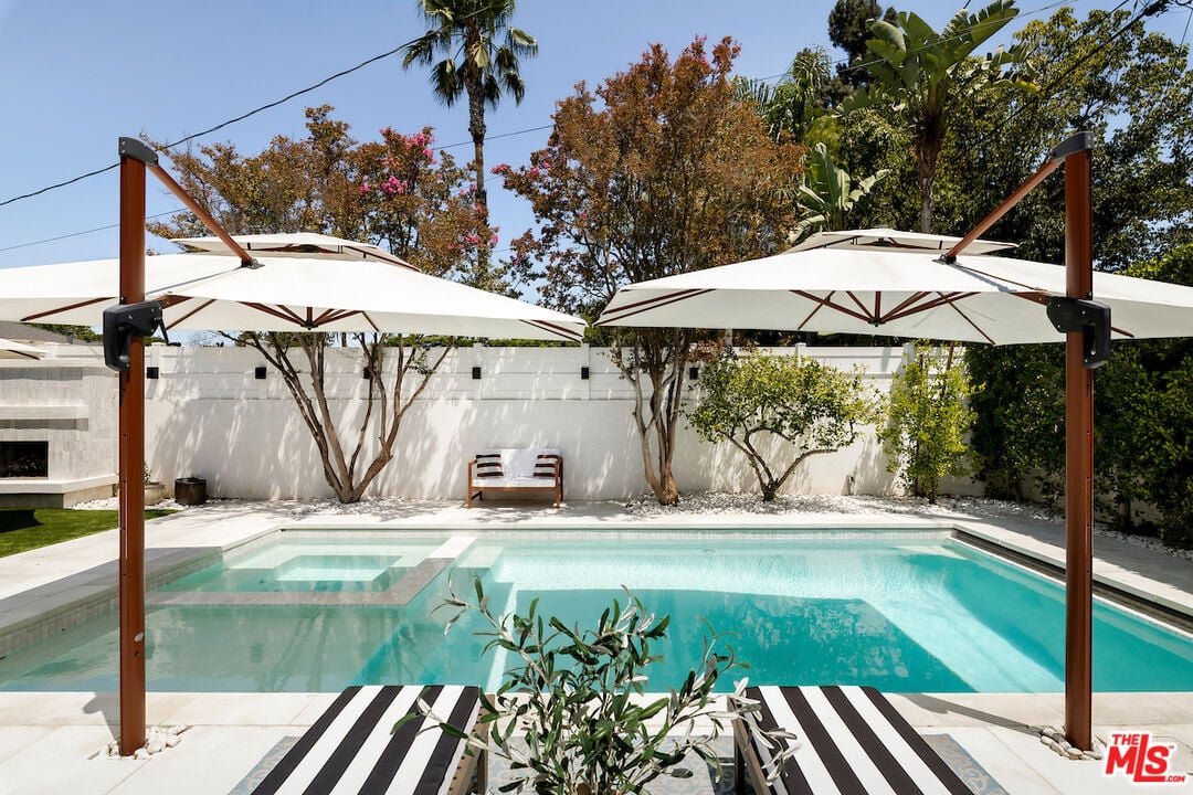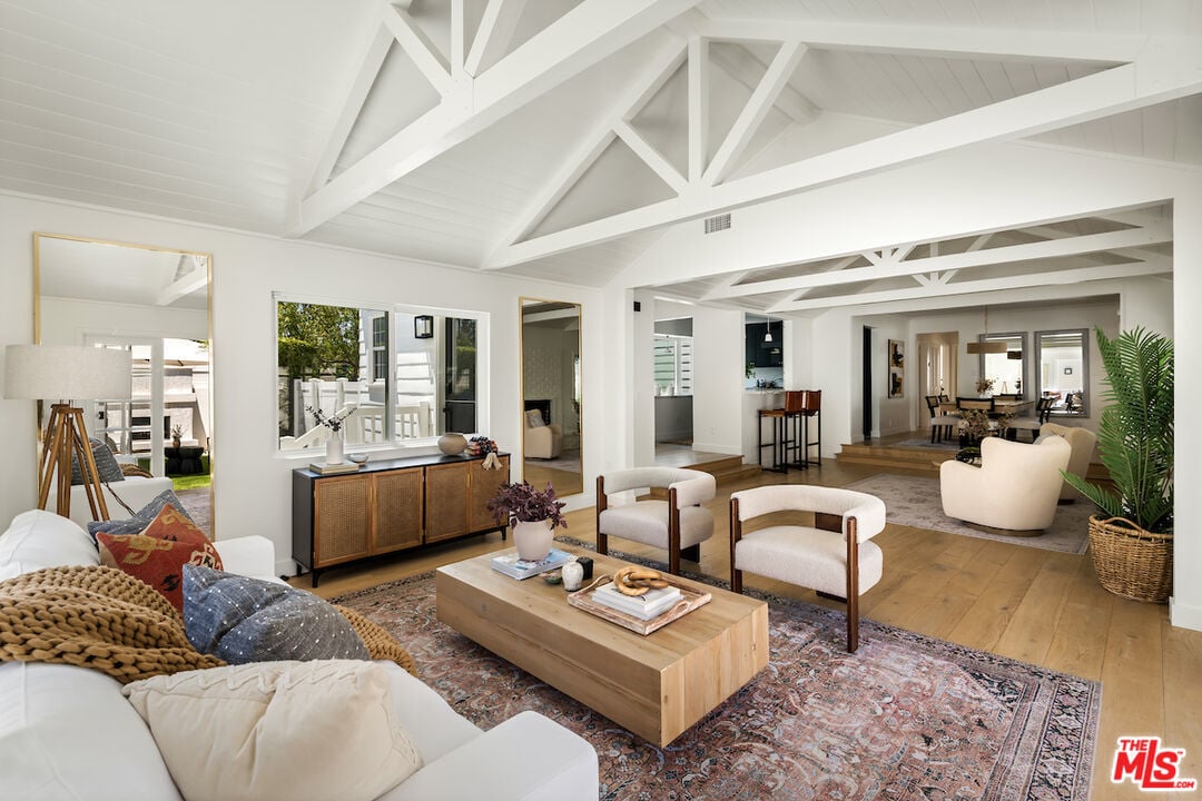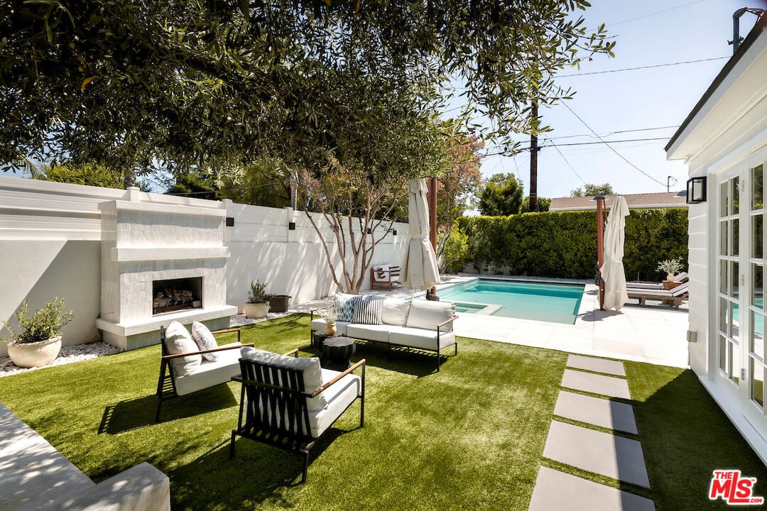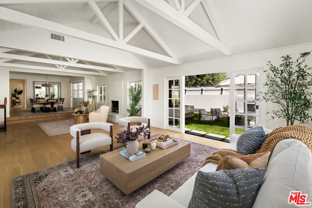 The vaulted-ceiling living room opens seamlessly to the backyard, creating the feeling of a private resort. Outside, you'll find multiple seating areas, a cozy outdoor fireplace and fire-pit, a dining area with built-in gas line, and a sparkling pool and spa adorned with high-end Zellige tiles and automated pool cover.
