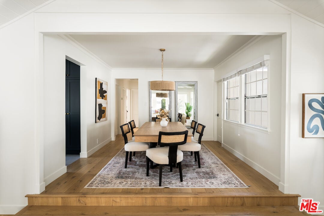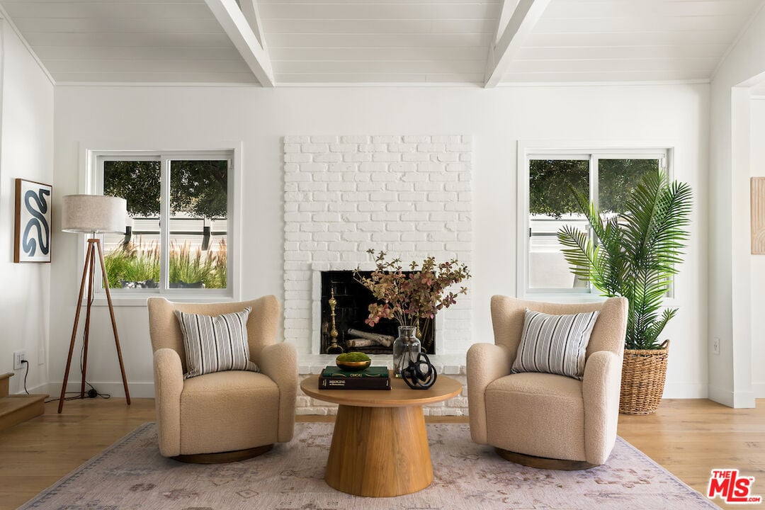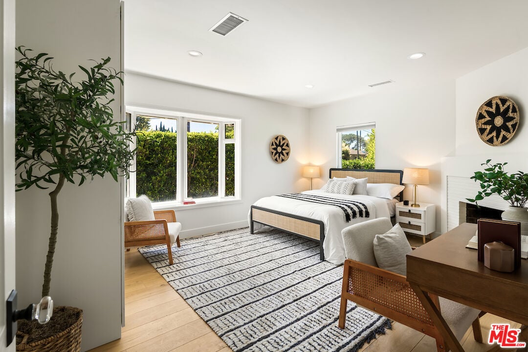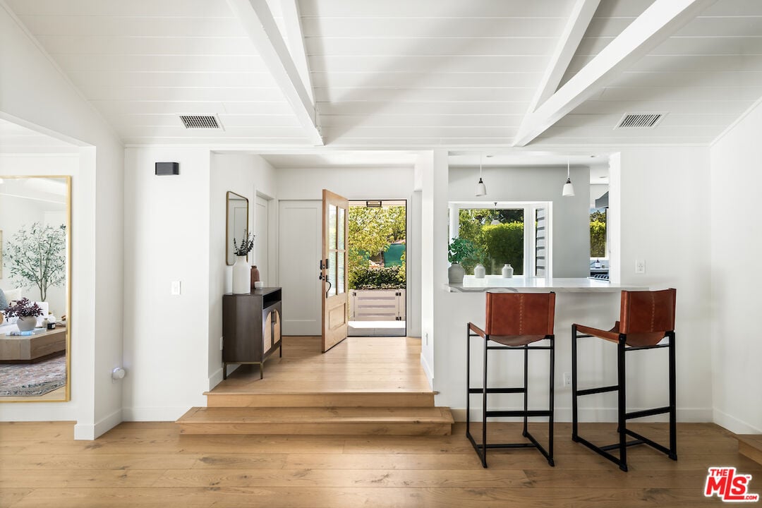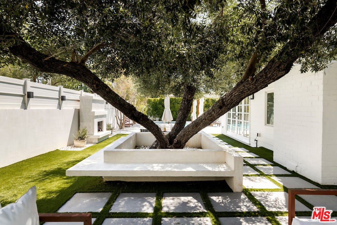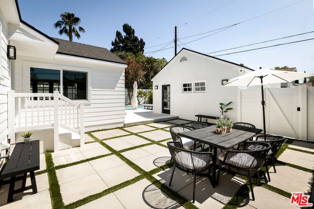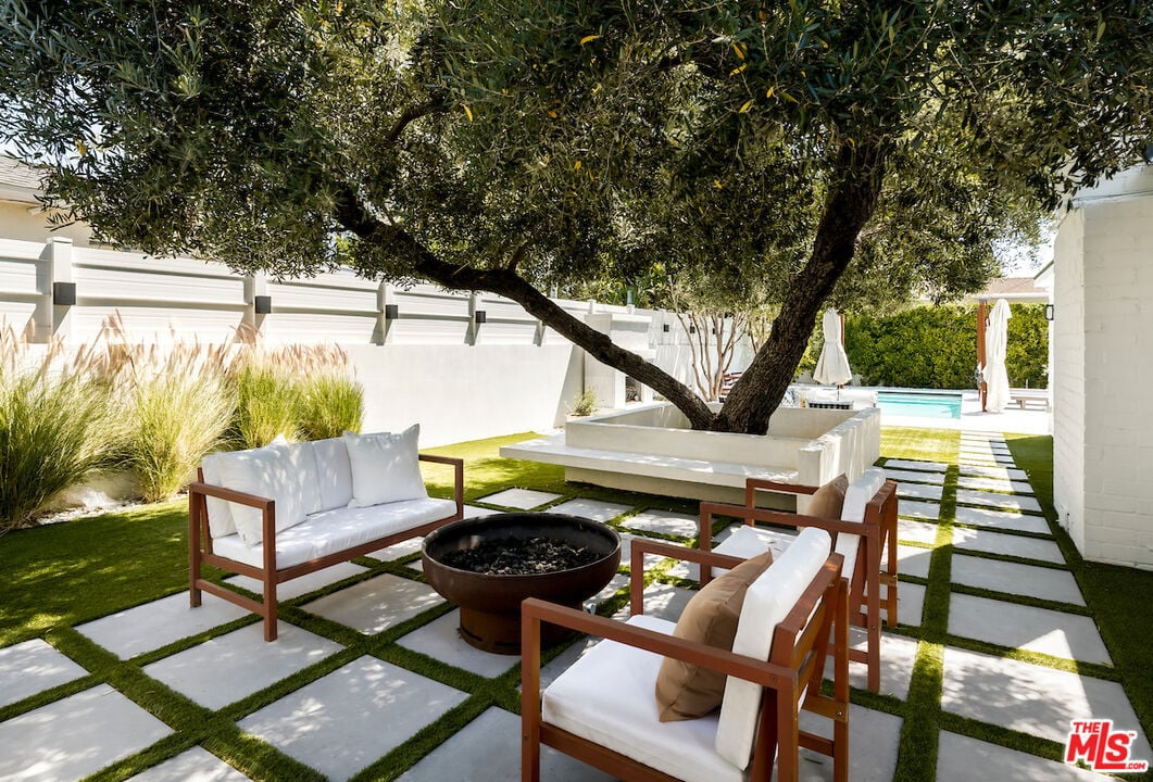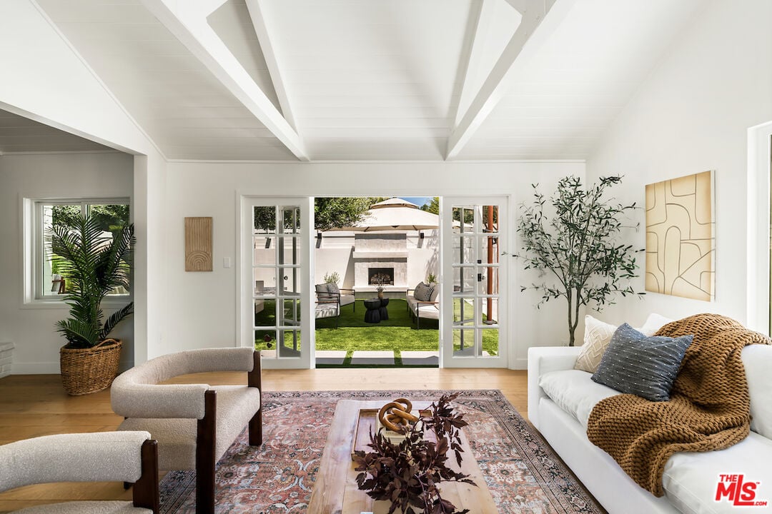 The vaulted-ceiling living room opens seamlessly to the backyard, creating the feeling of a private resort. Outside, you'll find multiple seating areas, a cozy outdoor fireplace and fire-pit, a dining area with built-in gas line, and a sparkling pool and spa adorned with high-end Zellige tiles and automated pool cover.
