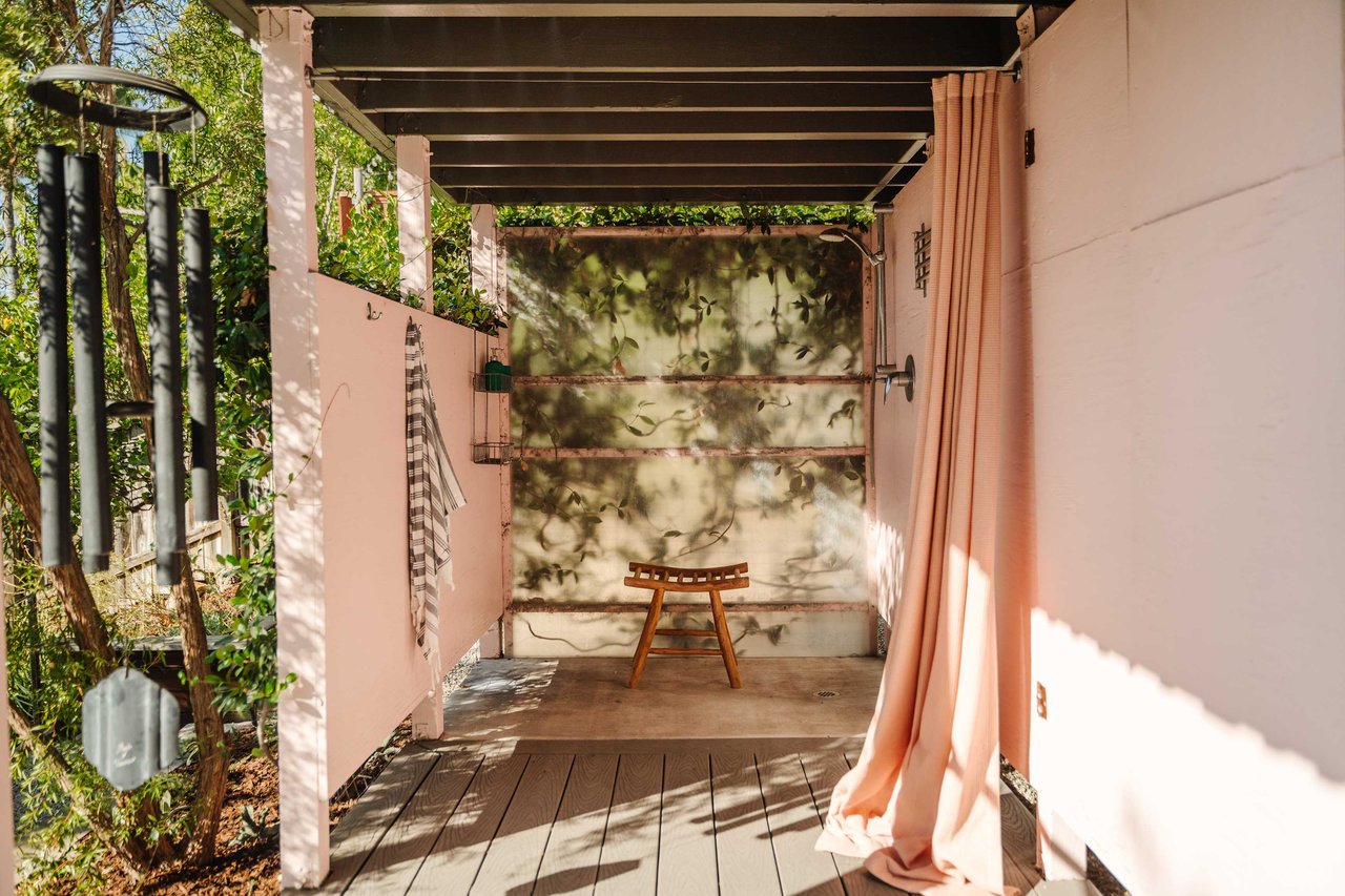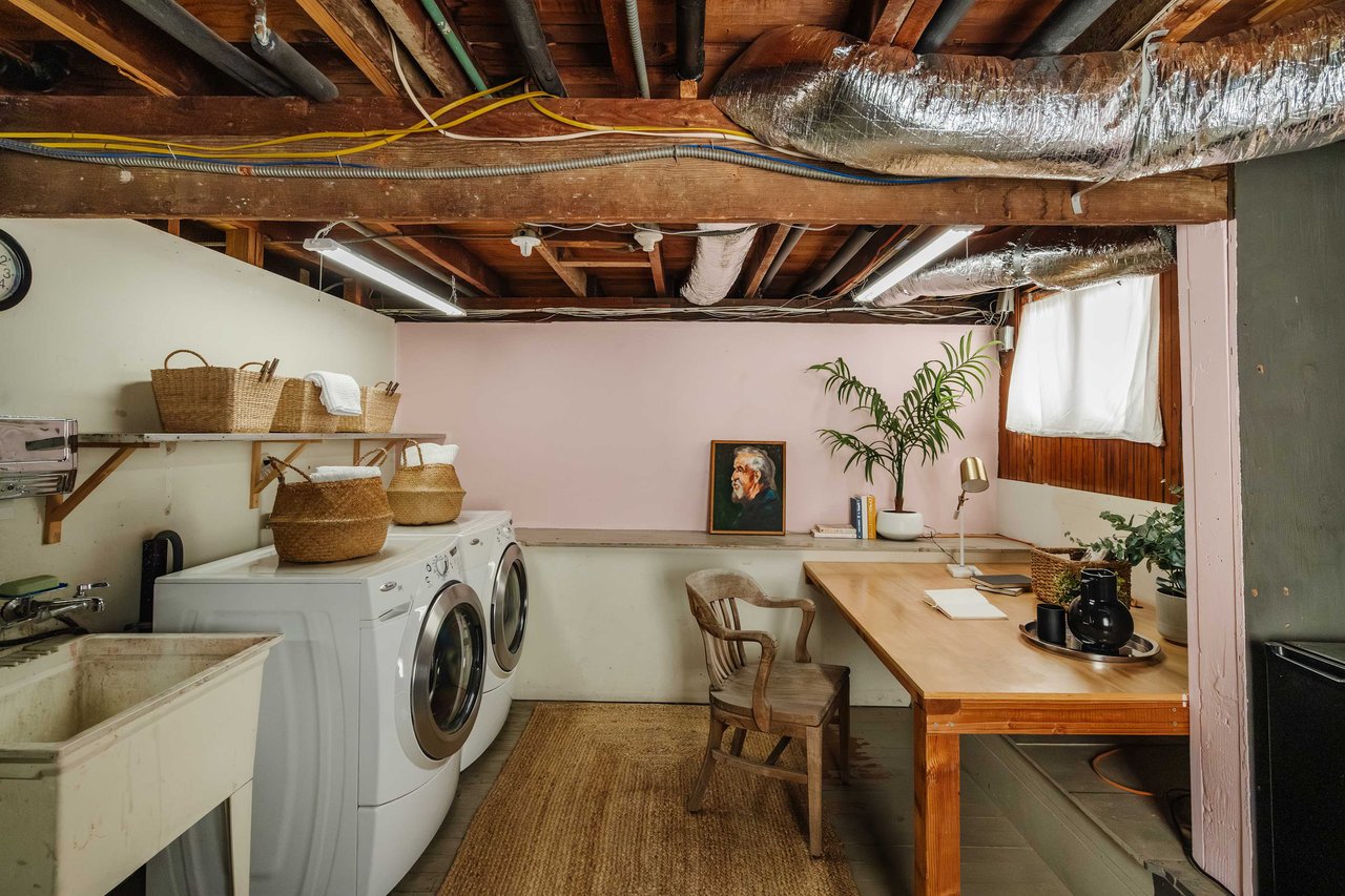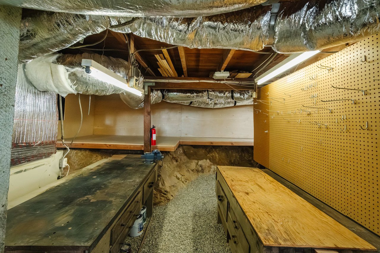 Find tranquil repose in your three well-proportioned bedrooms, two of which share a refreshing bath with an oversized soaking tub. The primary suite pampers you with a rejuvenating ensuite. French doors off the den open to an extensive, overlooking deck, ideal for alfresco gatherings or simply absorbing the peaceful ambiance and inspiring vistas. A few steps down, the lower level features a laundry room and an office area, and the home’s basement has a great workshop area perfect for the hobbies you’ve wanted to start but had no place to do them! There’s even built-in shelving that would be so much fun to set up a train track on (maybe that’s just the kid in us!). Outside, develop your green thumb in the three raised garden beds or hang out with guests in the soothing shade of the wooden terrace, accommodated by an idyllic outdoor shower convenient for reviving yourself after a long day of heavy work or play.
