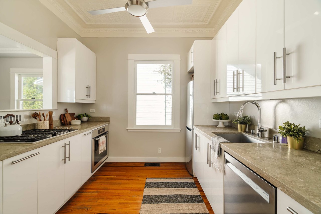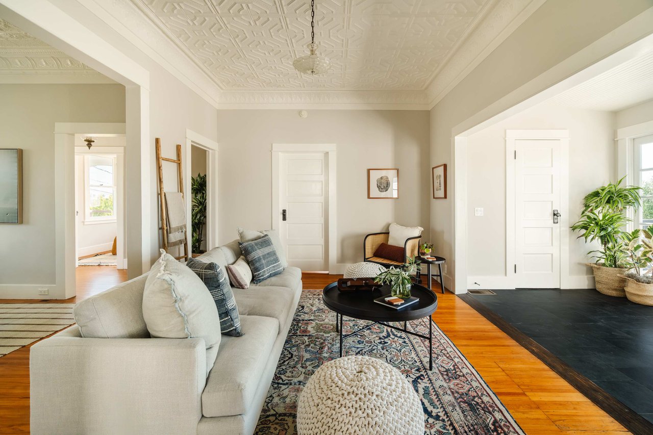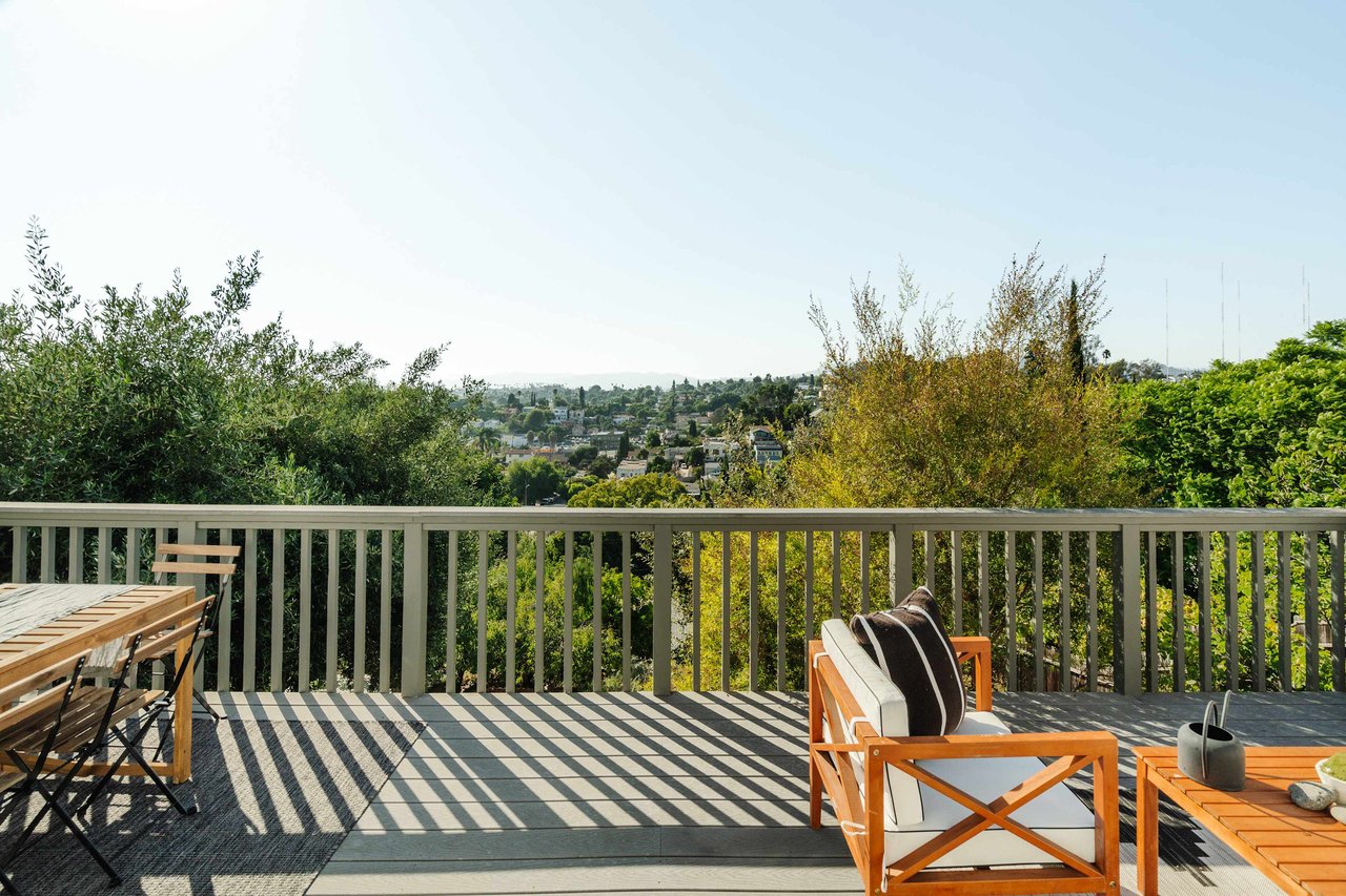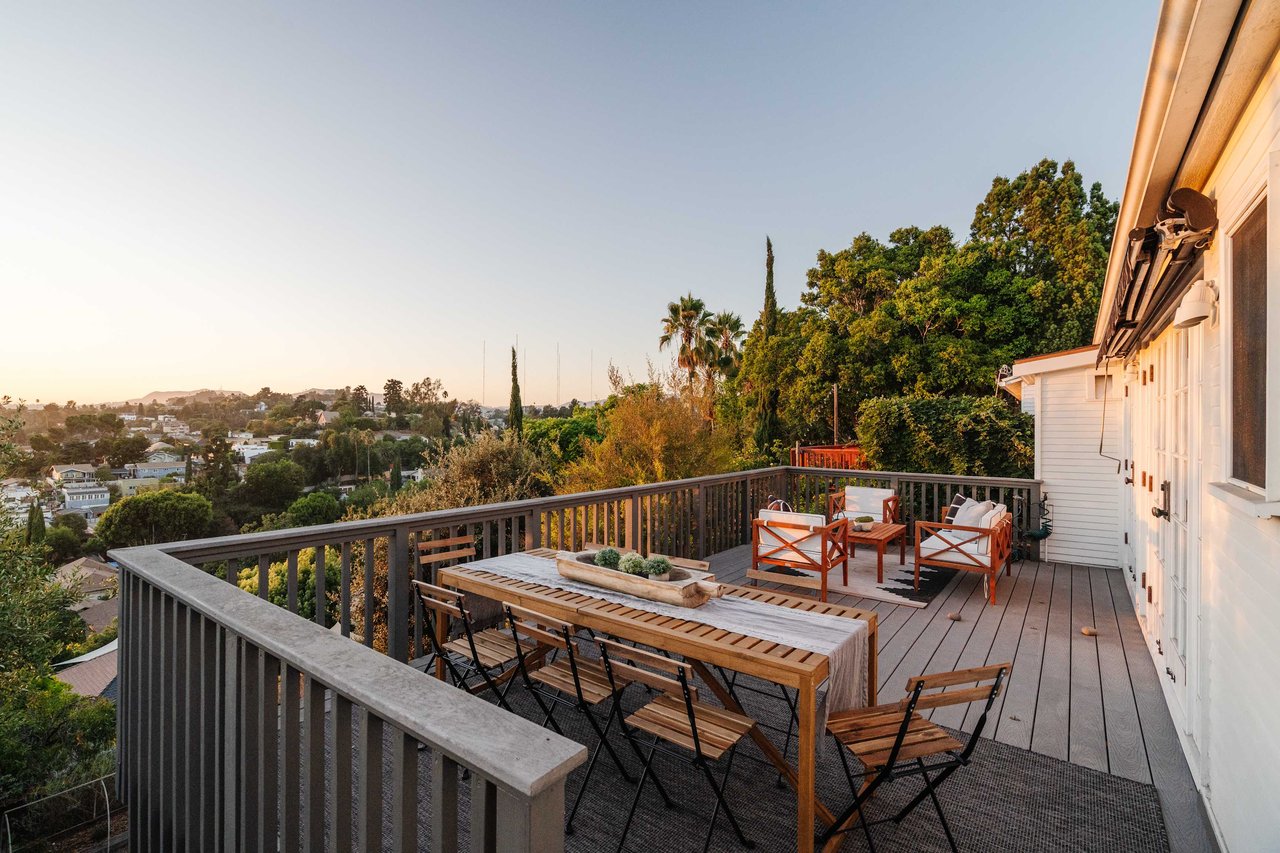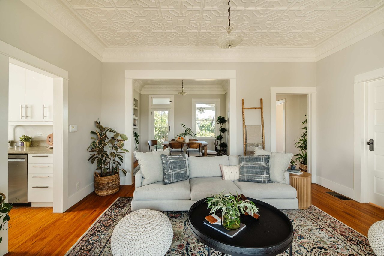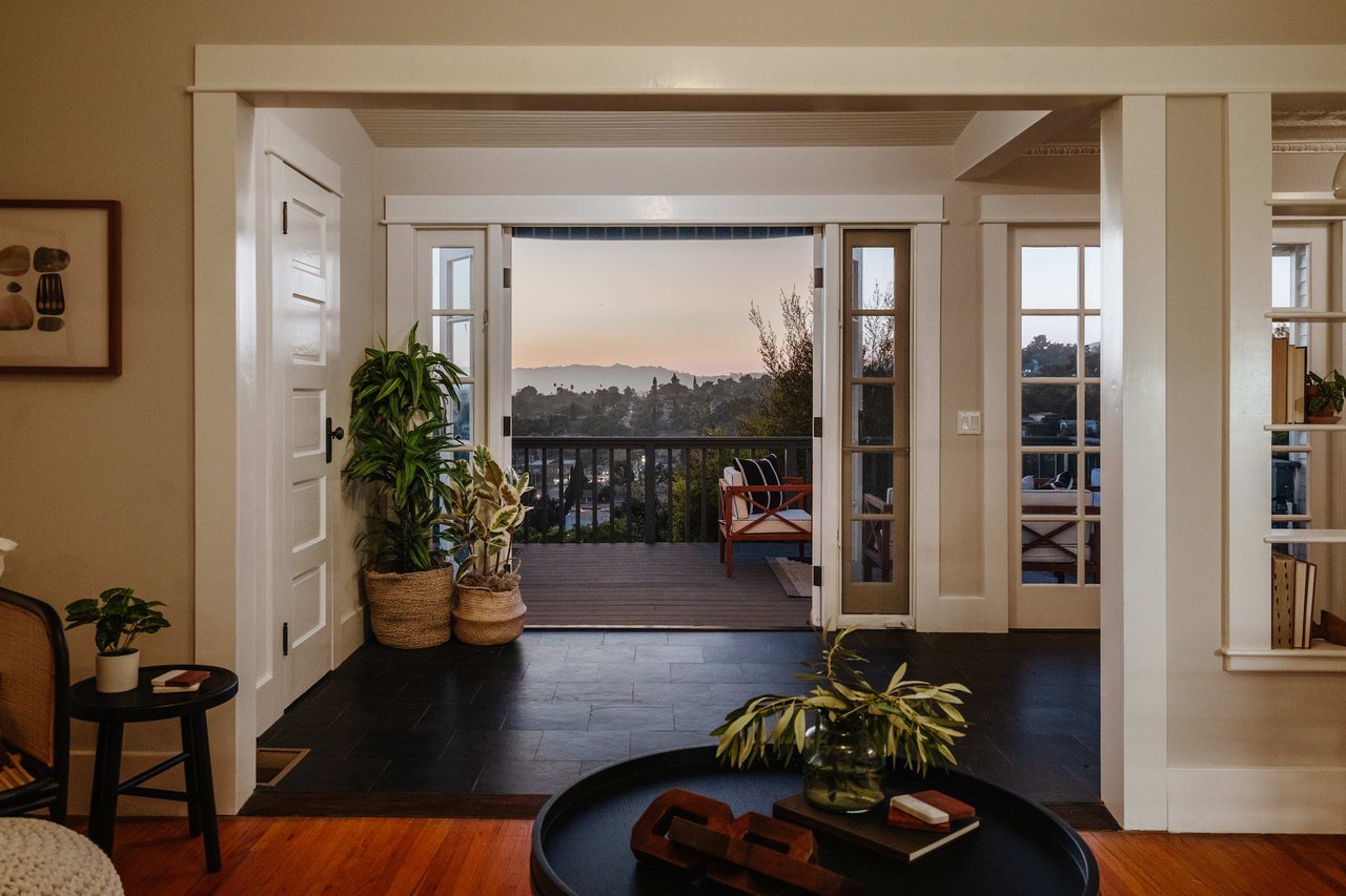 Dramatically perched in the hills of Echo Park, this 1922-built 3-bedroom, 2-bath residence is resplendent with a fruitful fig tree, lush grape vines, and drought-tolerant landscaping! Walk up the steps to this distinctive home’s covered porch - beckoning you to stop and become immersed in breathtaking downtown LA views. The captivating interior embodies timeless elegance with its classic high, painted tin ceilings, detailed crown moldings, and original hardwood flooring. Sophisticated fixtures set the mood across the seamlessly flowing living room and dining alcove, establishing a jovial atmosphere for relaxing and entertaining. The modern kitchen adds a tasteful contrast to the vintage finishes, sporting stainless steel appliances, sleek cabinetry, and limestone countertops.
