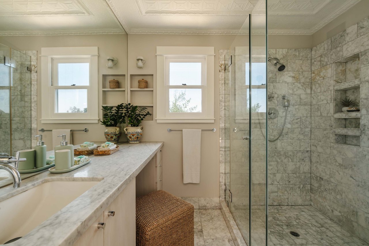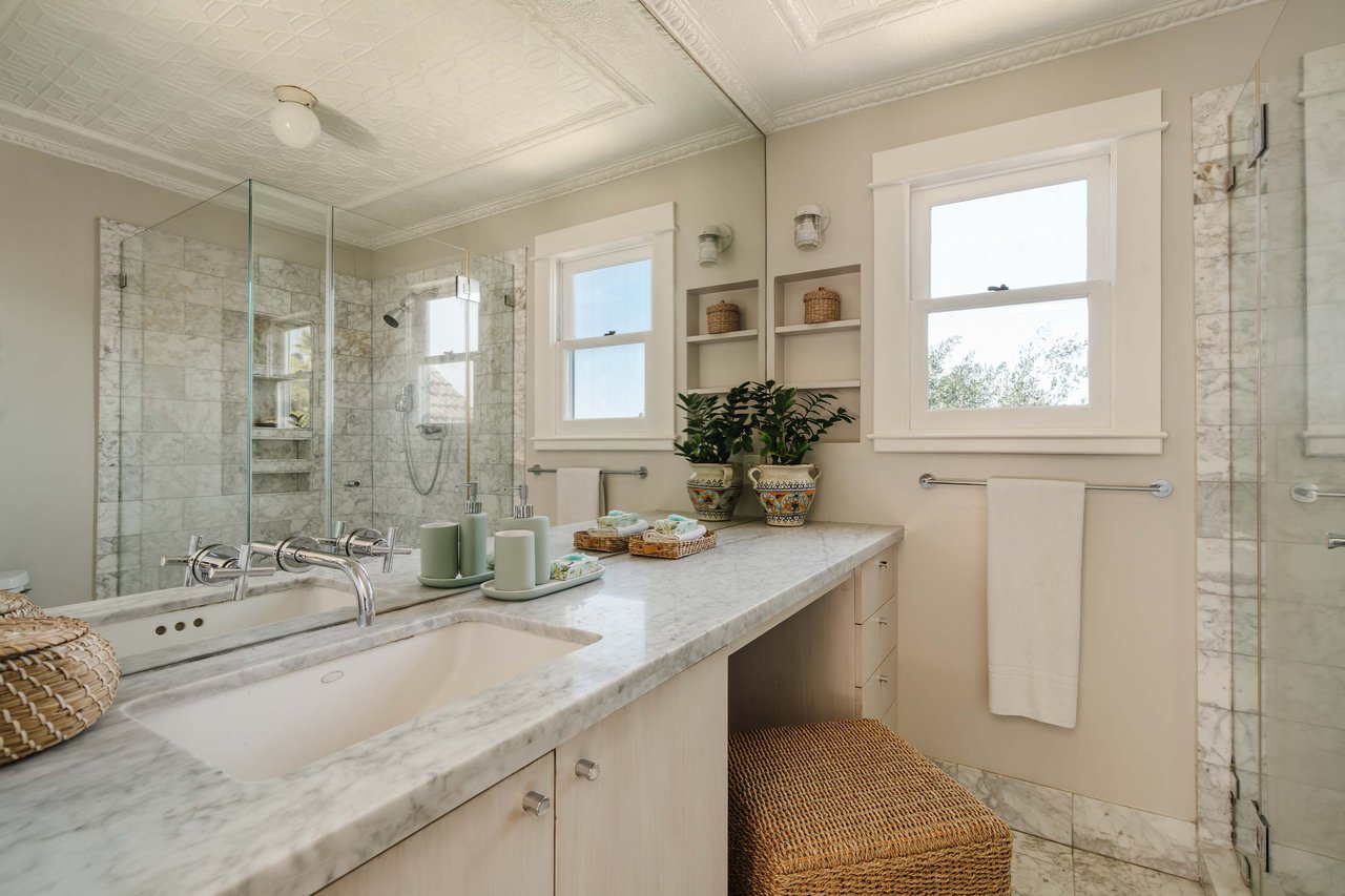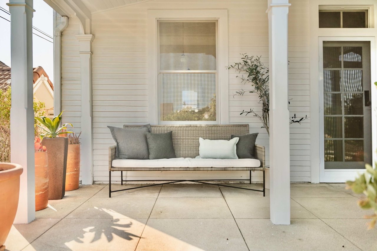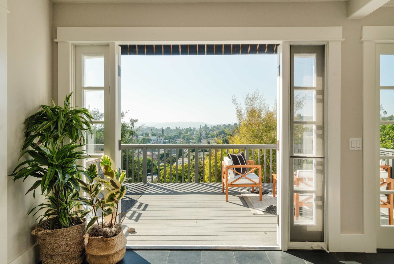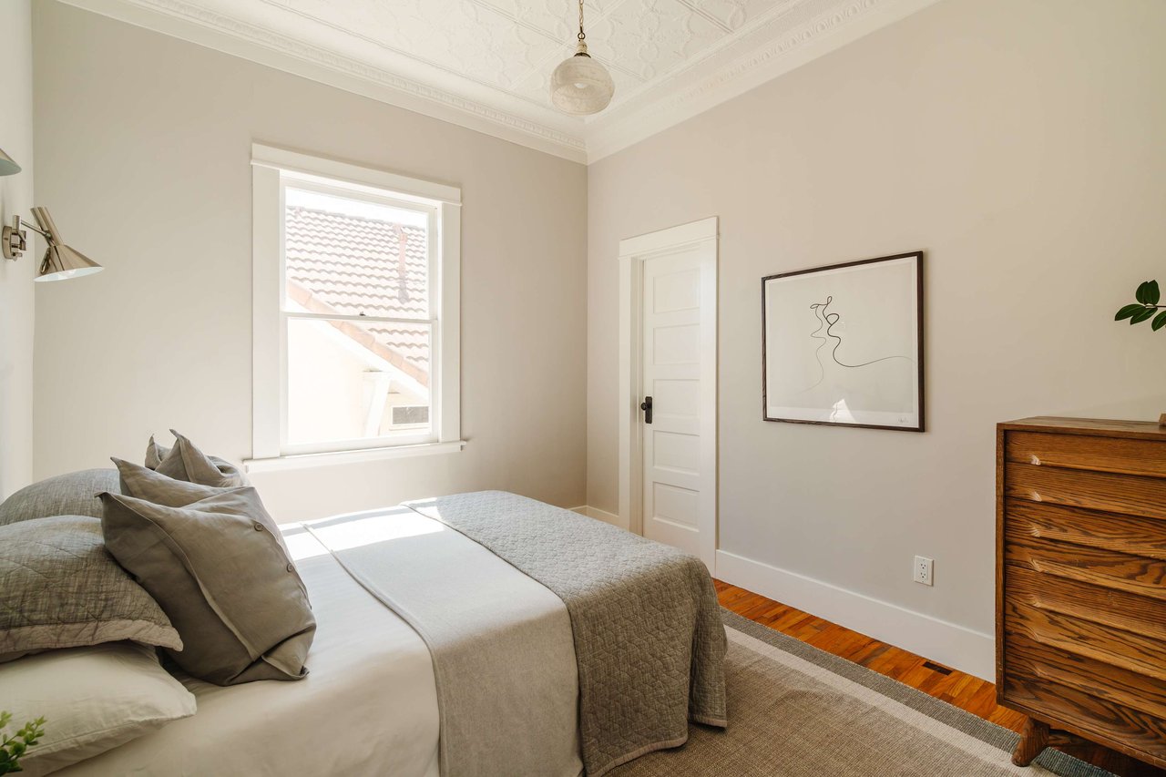 Dramatically perched in the hills of Echo Park, this 1922-built 3-bedroom, 2-bath residence is resplendent with a fruitful fig tree, lush grape vines, and drought-tolerant landscaping! Walk up the steps to this distinctive home’s covered porch - beckoning you to stop and become immersed in breathtaking downtown LA views. The captivating interior embodies timeless elegance with its classic high, painted tin ceilings, detailed crown moldings, and original hardwood flooring. Sophisticated fixtures set the mood across the seamlessly flowing living room and dining alcove, establishing a jovial atmosphere for relaxing and entertaining. The modern kitchen adds a tasteful contrast to the vintage finishes, sporting stainless steel appliances, sleek cabinetry, and limestone countertops.