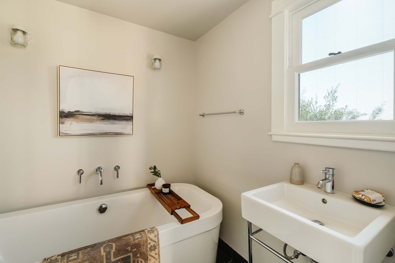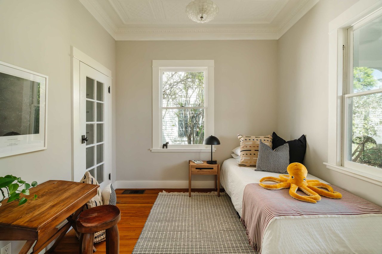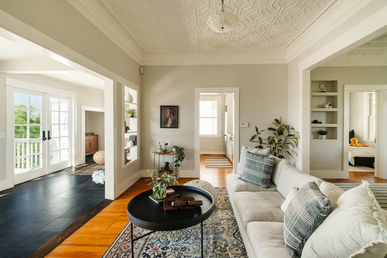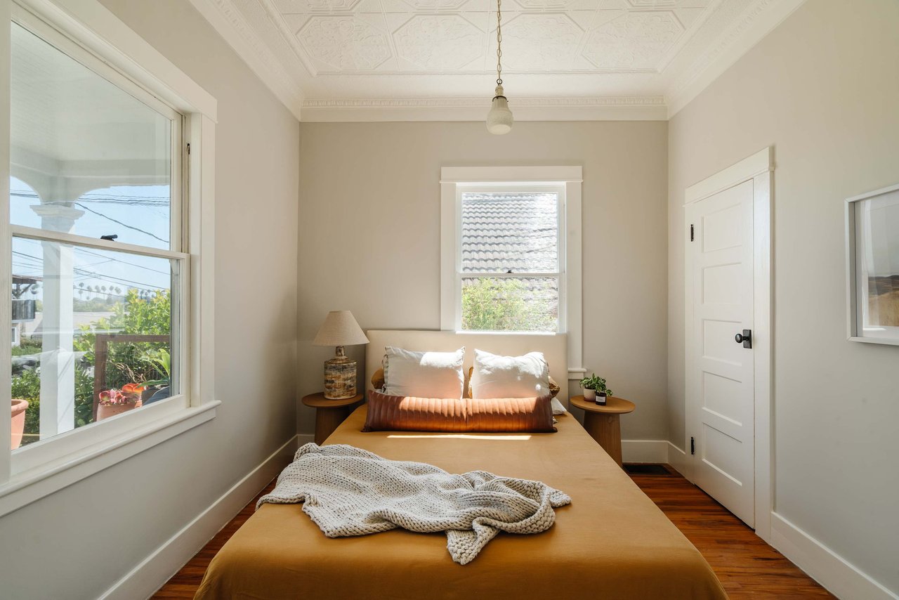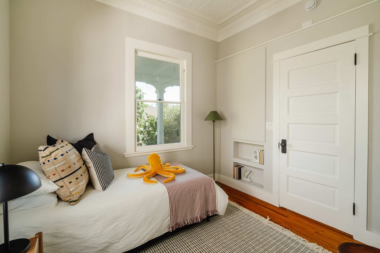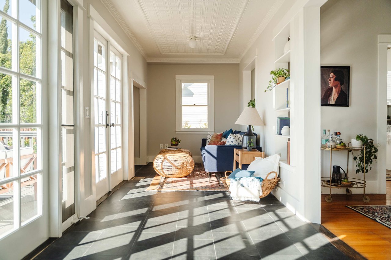 Dramatically perched in the hills of Echo Park, this 1922-built 3-bedroom, 2-bath residence is resplendent with a fruitful fig tree, lush grape vines, and drought-tolerant landscaping! Walk up the steps to this distinctive home’s covered porch - beckoning you to stop and become immersed in breathtaking downtown LA views. The captivating interior embodies timeless elegance with its classic high, painted tin ceilings, detailed crown moldings, and original hardwood flooring. Sophisticated fixtures set the mood across the seamlessly flowing living room and dining alcove, establishing a jovial atmosphere for relaxing and entertaining. The modern kitchen adds a tasteful contrast to the vintage finishes, sporting stainless steel appliances, sleek cabinetry, and limestone countertops.
