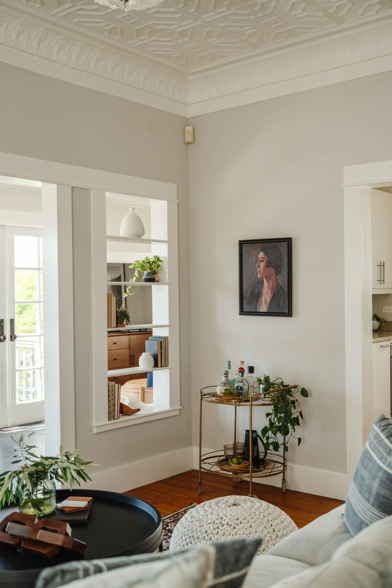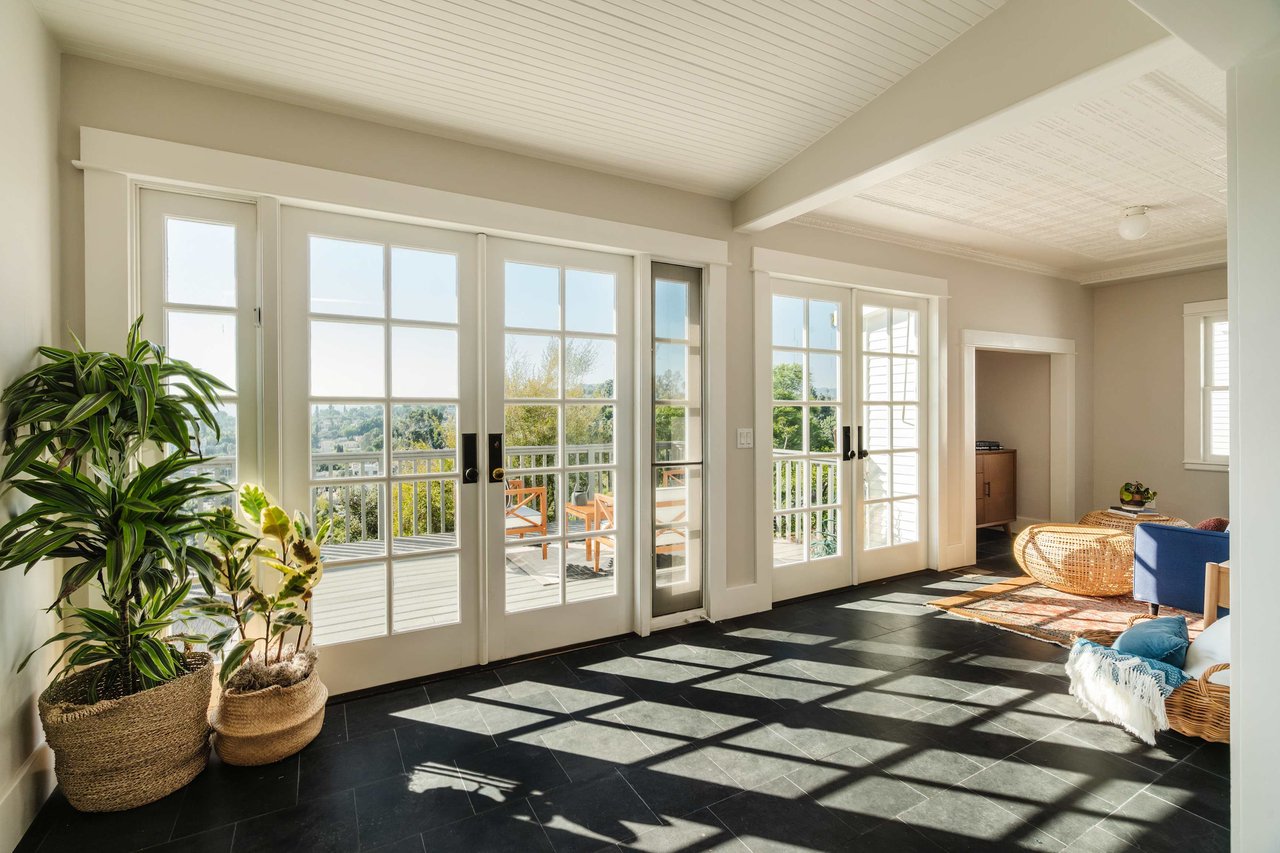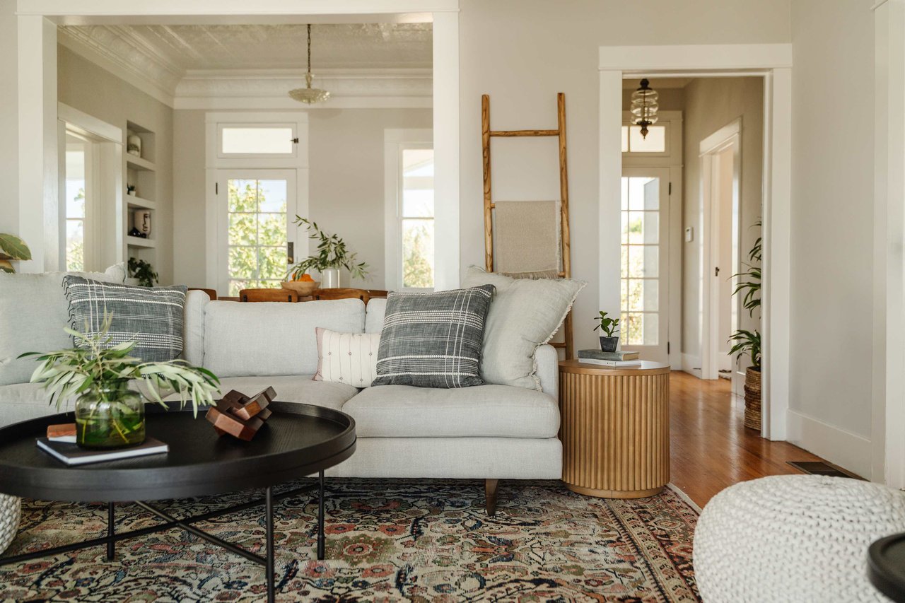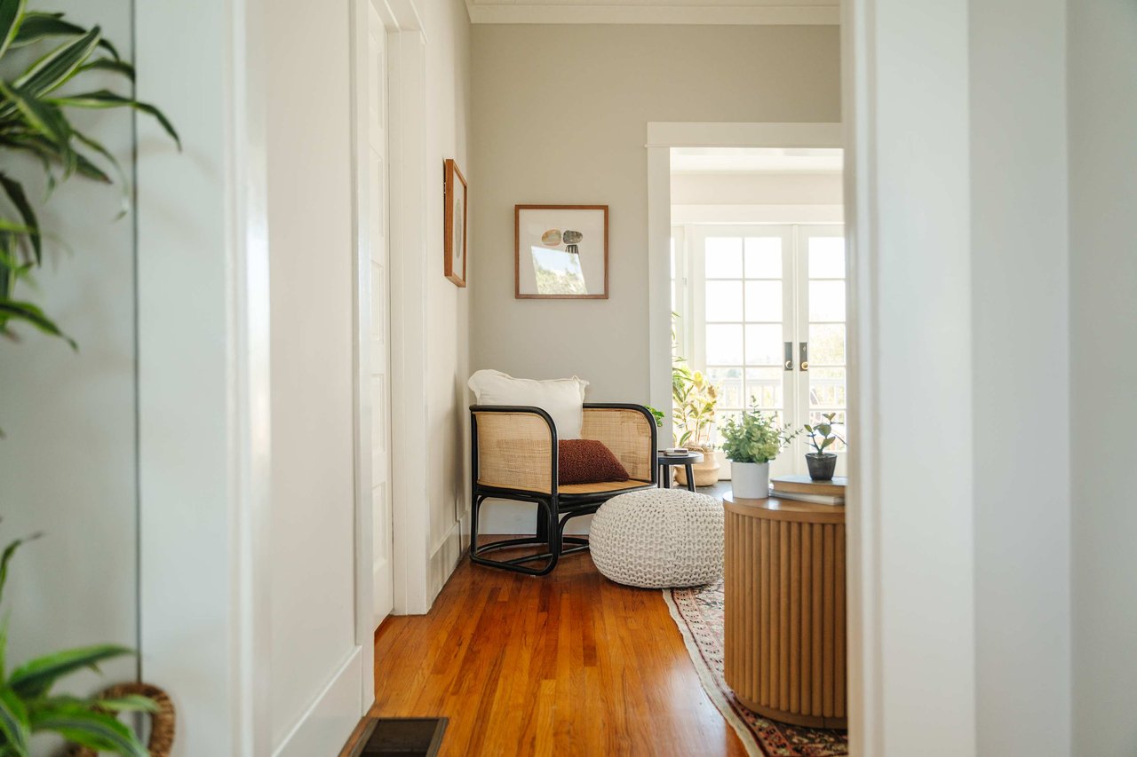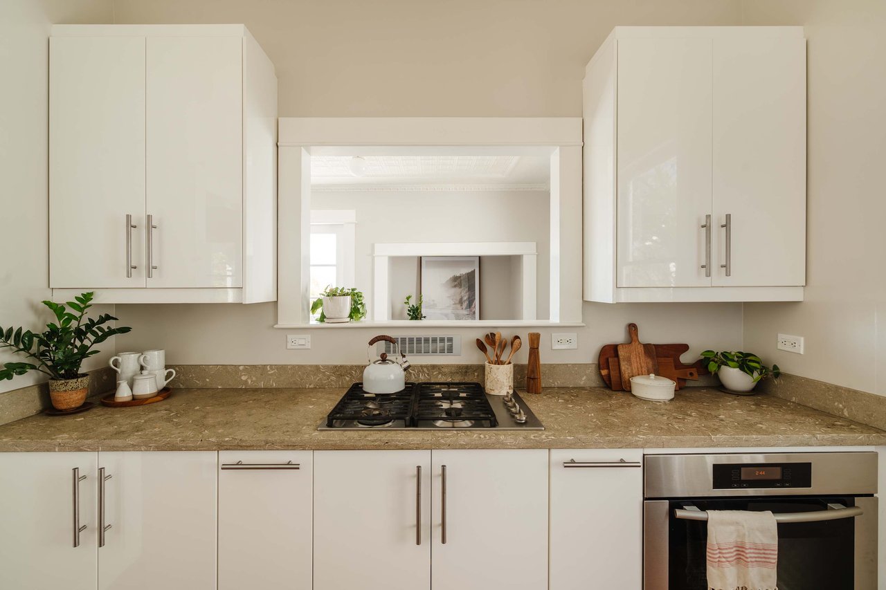 Dramatically perched in the hills of Echo Park, this 1922-built 3-bedroom, 2-bath residence is resplendent with a fruitful fig tree, lush grape vines, and drought-tolerant landscaping! Walk up the steps to this distinctive home’s covered porch - beckoning you to stop and become immersed in breathtaking downtown LA views. The captivating interior embodies timeless elegance with its classic high, painted tin ceilings, detailed crown moldings, and original hardwood flooring. Sophisticated fixtures set the mood across the seamlessly flowing living room and dining alcove, establishing a jovial atmosphere for relaxing and entertaining. The modern kitchen adds a tasteful contrast to the vintage finishes, sporting stainless steel appliances, sleek cabinetry, and limestone countertops.